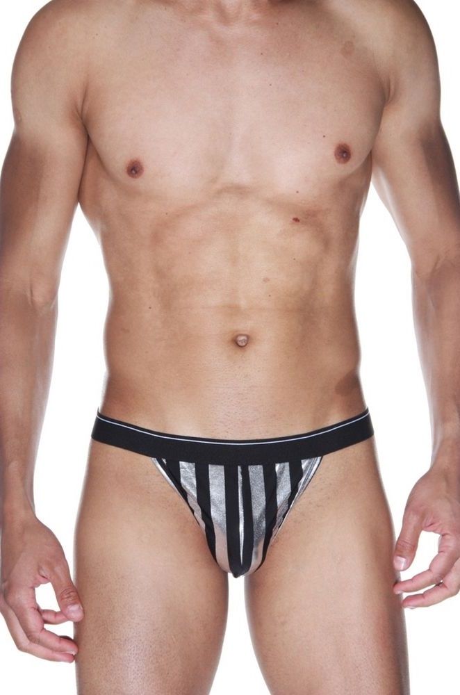 Черные мужские трусы-тонги в серебристую полоску.