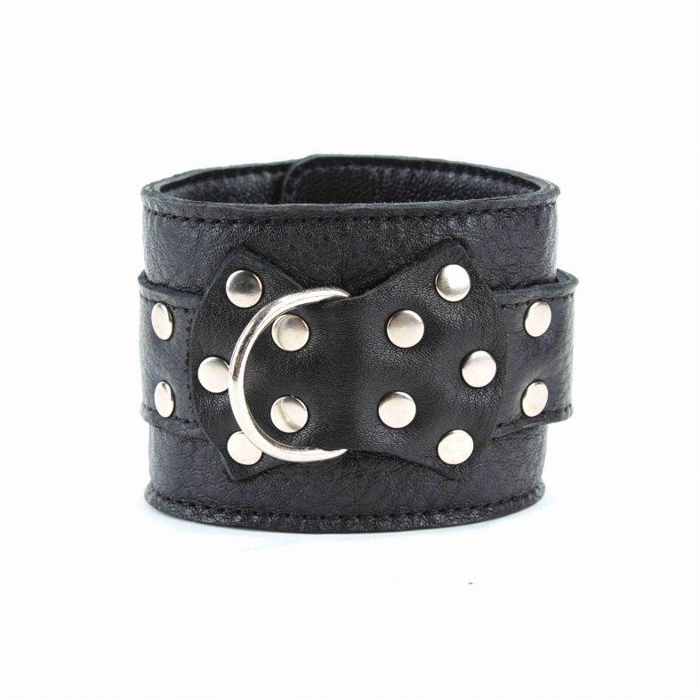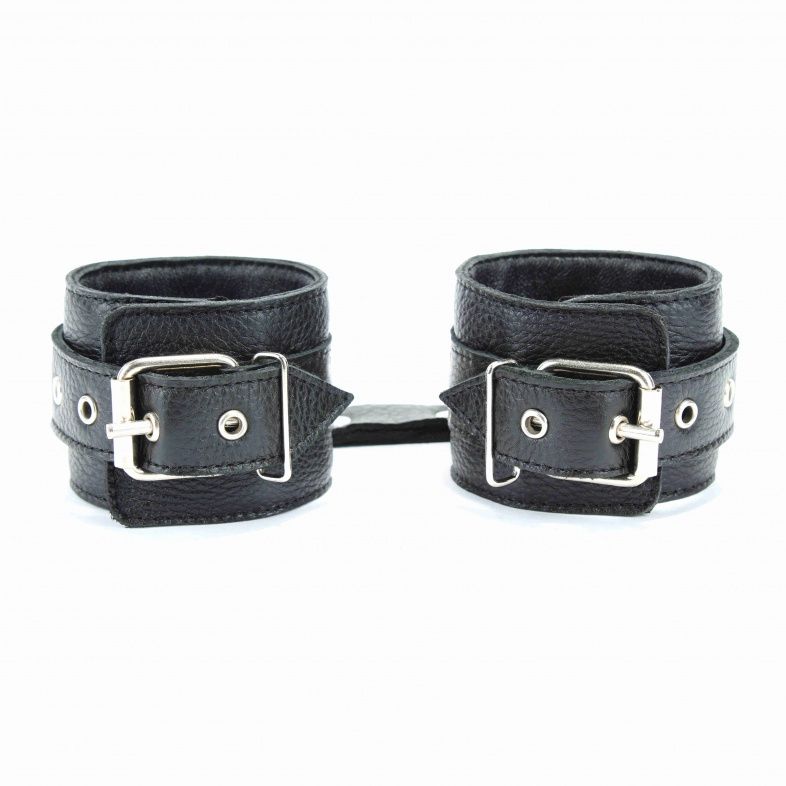 Кожаные наручники черного цвета. Украшены заклепками и соединяются между собой цепью с карабинами/ Размер наручников регулируется при помощи застежки Ширина - 6 см. Длина цепочки - 15,5 см.