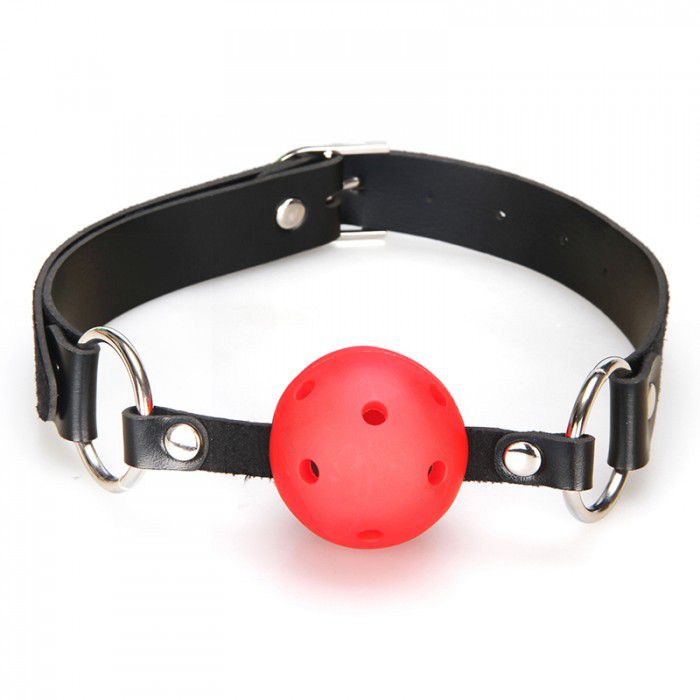 Кляп в виде пластикового шарика с отверстиями, которые позволяют дышать через рот во время фетиш-игр. Кляп фиксируется с помощью ремешка из искусственной кожи с металлическими элементами как кольца и кнопки, придающими дополнительную прочность и особый дизайн изделию. Ремешок регулирует длину обхвата кляпа от 42 до 60 см.