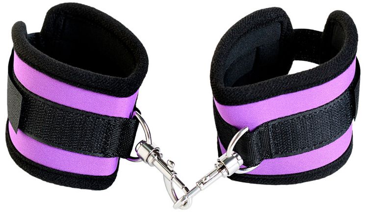 Наручники фиолетовые неопреновые. Мягкие манжеты с застежкой велкро, позволяющей максимально регулировать объем. Между собой наручники соединены карабинами.